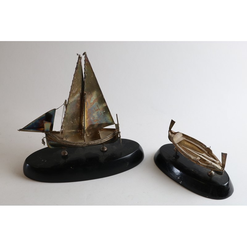 Silver Model of a Chinese Schooner together with another Silver Model of Rowing Boat