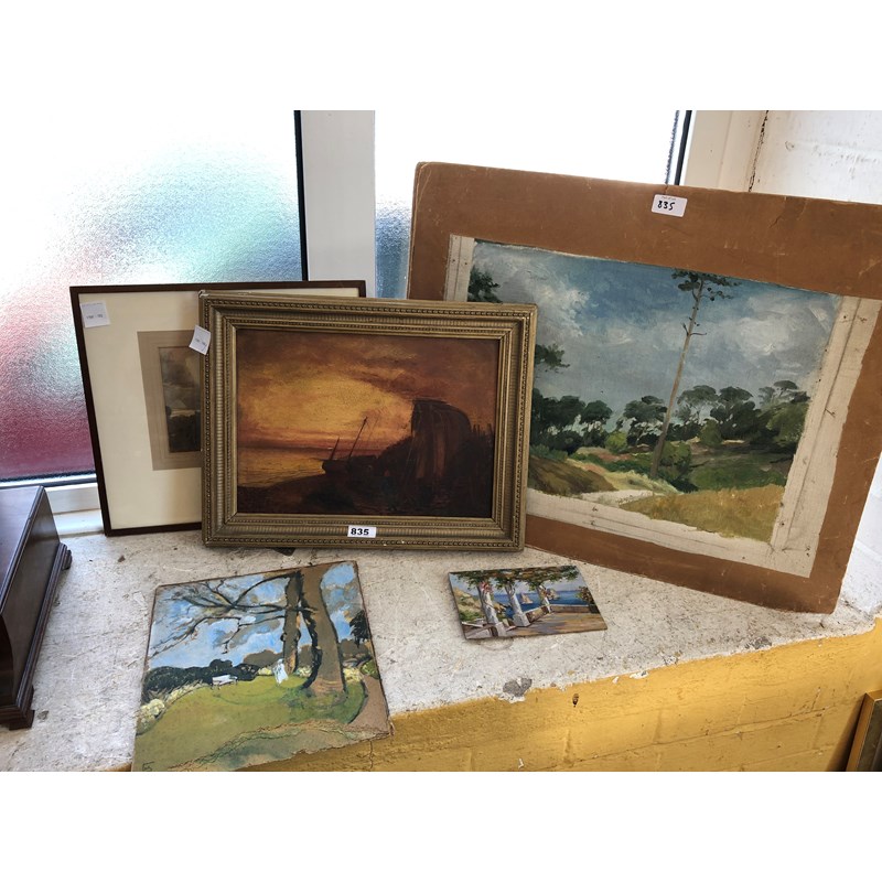 Oil on Board Sunset Coastal Scene together with Four Other Pictures in Oil and Watercolour (5)
