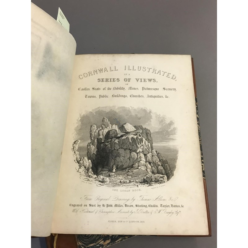 Britton, John and Edward Wedlake Brayley. Devonshire and Cornwall Illustrated, 2 volumes, 2 engraved map frontispieces, 2 engraved titles, 138 engraved views on 69 leaves, tissue guards, some spotting, early twentieth century half calf, 4to, London: Fisher and Son, 1831