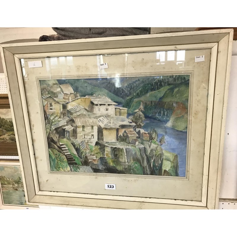 Large Watercolour, 'Town Scene above a Gorge`, 1930s
