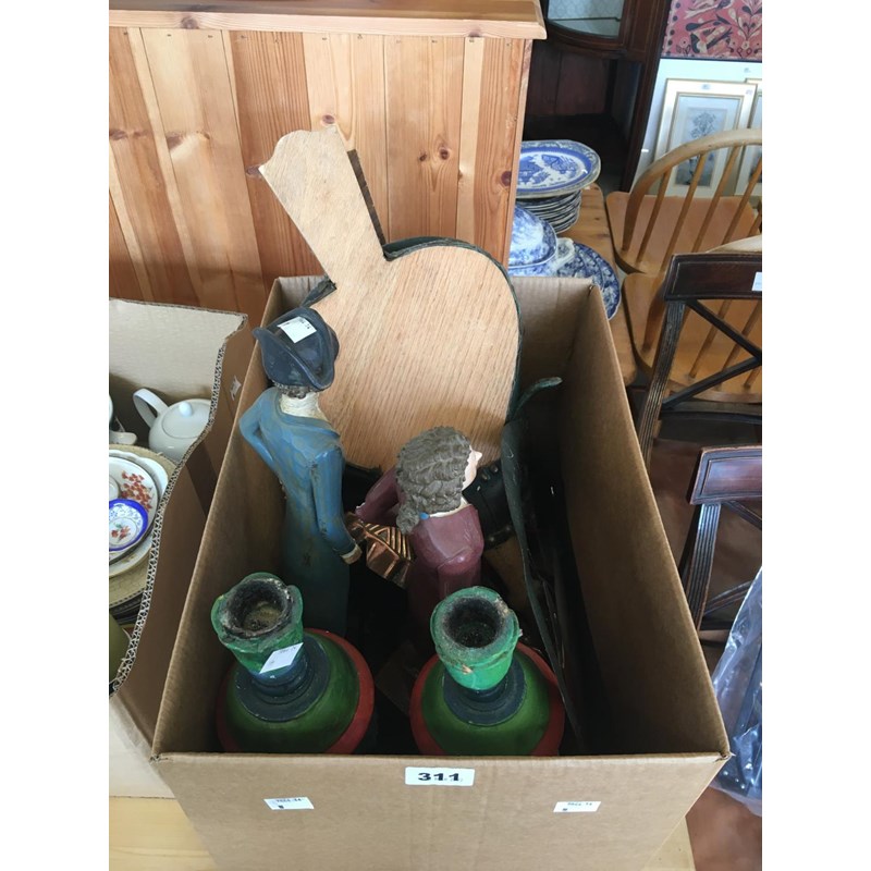 Box of Assorted Items: Painted Wooden Candlesticks, Iron Pieces, Bellows, Copper Fish Mould, Two Figures etc