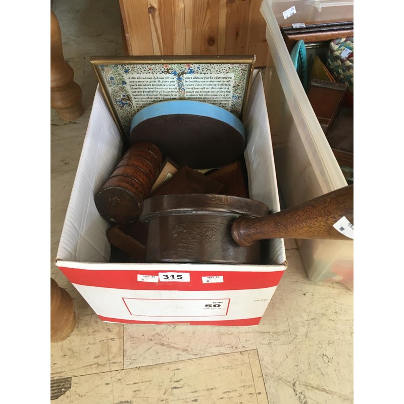 Wooden Box, Porcelain and Other Items to include a Large Magnifier, Spice Box, Pictures, etc