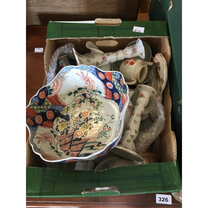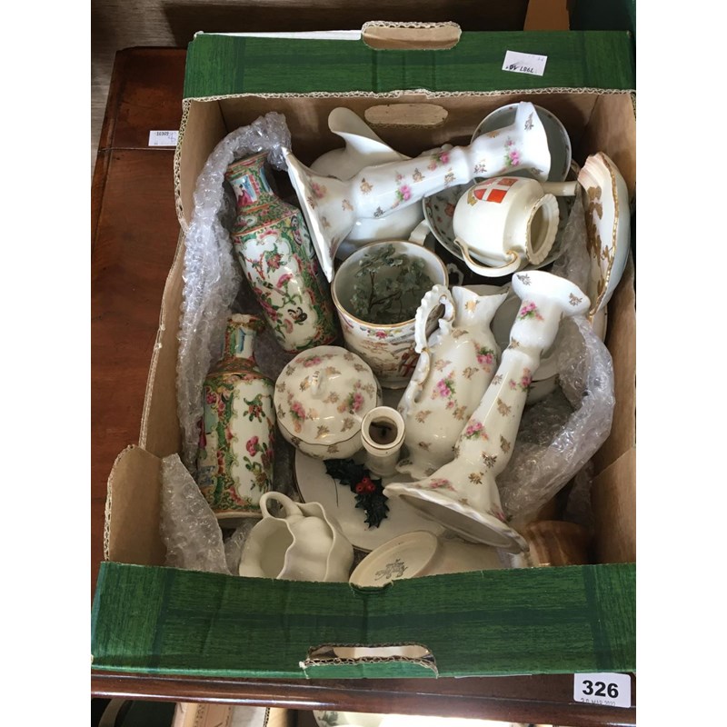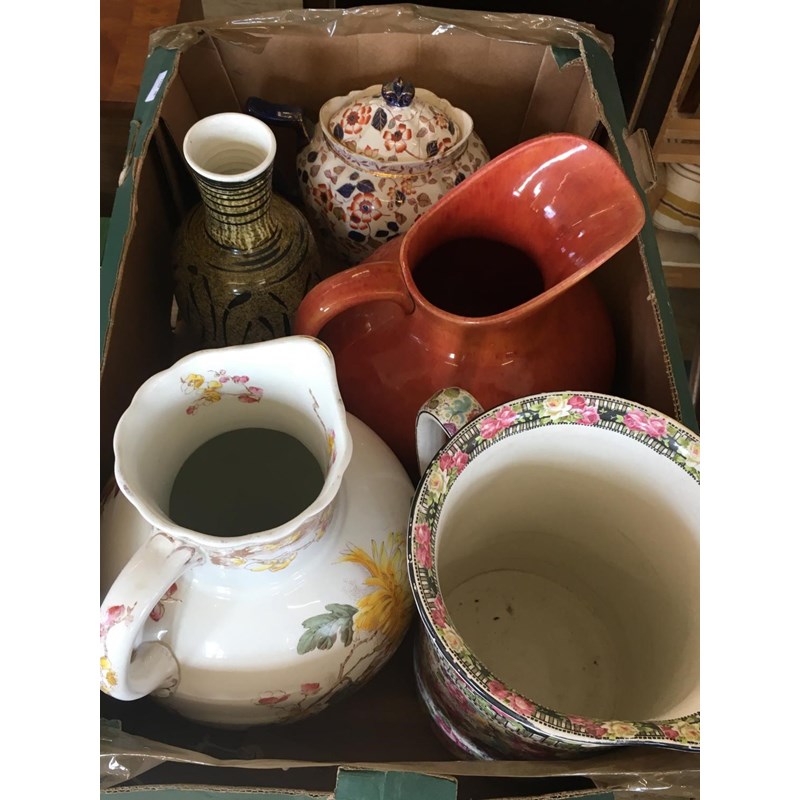 Two Boxes of Assorted China, Pottery Jugs, Candlesticks, etc