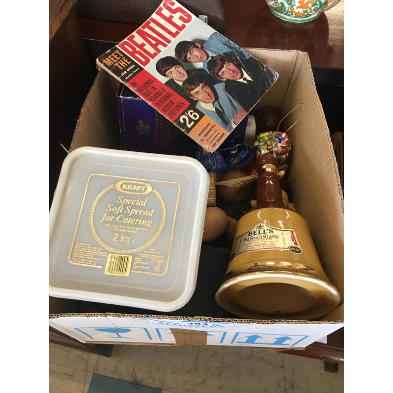 Box of Assorted Collectables to include Cameras, a Bells Whisky Bottle, etc