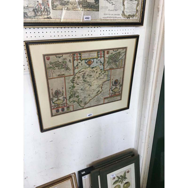 Speed, John. Rutlandshire with Oakham and Stanford, hand-coloured engraved map, 556mm x 378mm, London: John Sudbury and George Humbell, [1611], framed and glazed